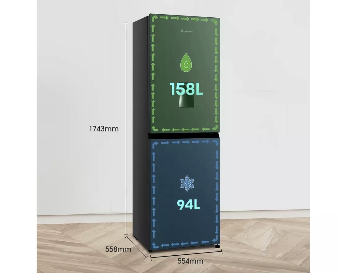 The Fridgemaster fridge freezer is here to make your kitchen life a breeze! With 252L of space, it stores up to 13 bags of shopping without breaking a sweat. The LED light shows everything inside, the dial control is easy to set, and the pull-out freezer tray stops you digging through frozen food. The non-plumbed water dispenser provides cool water on demand, while its super-quiet operation keeps your kitchen peaceful. Reliable, efficient and hassle-free, the Fridgemaster makes food storage a breeze.